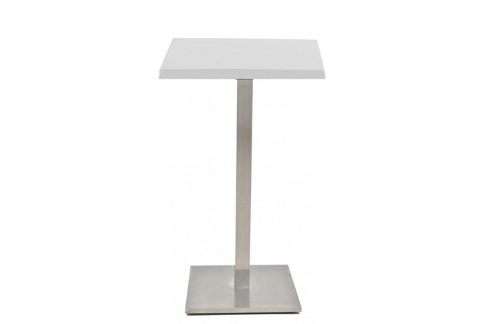 Mesa alta con pie central, acero inoxidable pulido - acabado satinado -. Base de 45 x 45 cms y tapa de 70 x 70 cms, a elegir. Uso en interiores.