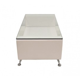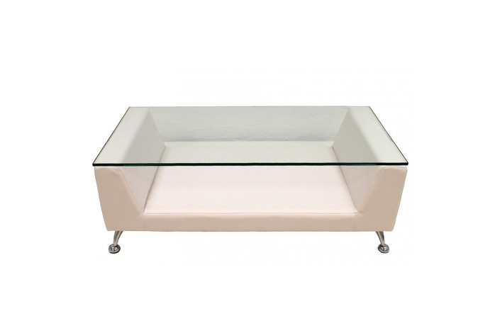 Mesa de diseño, armazón revestido en similpiel de color blanco, tapa de cristal templado.
