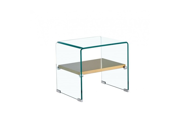 -Fabricada de cristal curvado de 12 mm. de espesor acabado transparente. Estante inferior revestido de acero inoxidable con acabado dorado