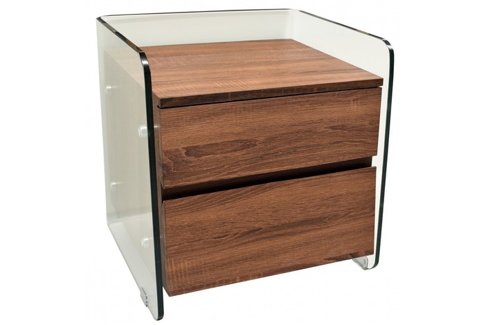 Mesa de diseño, cristal curvado, 2 cajones de MDF en acabado melamina de color madera vintage. Muy polivalente. Ideal como mesa de noche. Altura 50 cms.