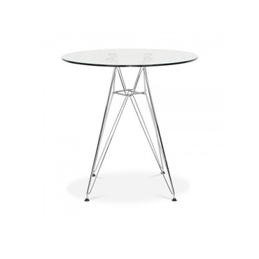 Mesa de diseño, base metálica cromada, tapa de cristal templado. Sillas y sillones a juego