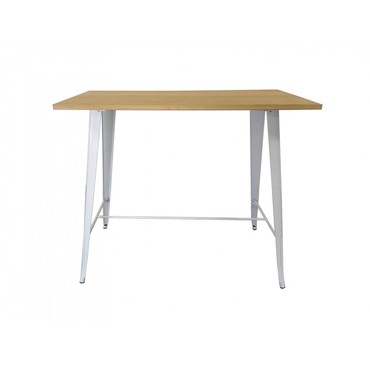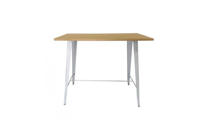 Mesa de diseño, alta, estructura de acero, pintada en blanco, tapa de madera maciza de olmo con acabado natural. Uso en interiores o exteriores. Taburete a juego