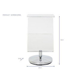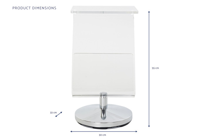 Dimensiones (cm) Longitud 30  |  Fondo 33  |  Altura 55 Peso neto producto (kg) 7,00 Material Acrilico  |  Metal