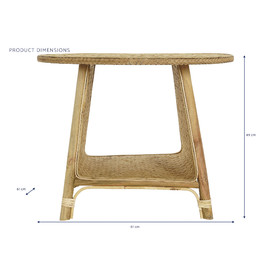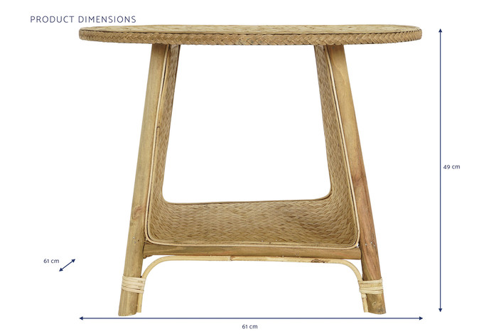 Dimensiones (cm) Longitud 61  |  Fondo 61  |  Altura 49 Peso neto producto (kg) 3,00 Material Bambu  |  Ratan