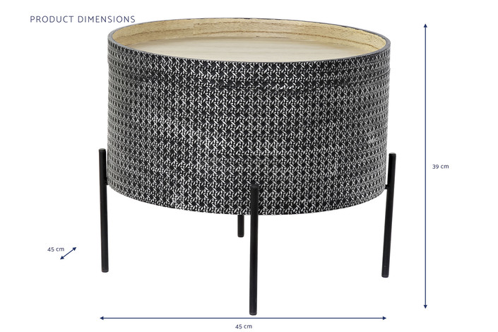 Dimensiones (cm) Longitud 45  |  Fondo 45  |  Altura 39 Peso neto producto (kg) 5,00 Material Mdf  |  Metal
