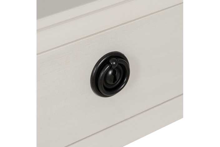 Material: top, cajones Dm - estructura madera de pino. Medida cajón: 30x10cm. Altura patas hasta leja: 14.5cm. Altura hueco: 29cm.