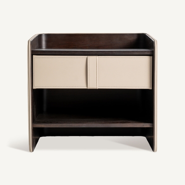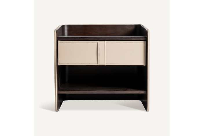 Mesita de noche, fabricado en madera contrachapada en color marrón, combinado con chapa de roble y polipiel en color beige.