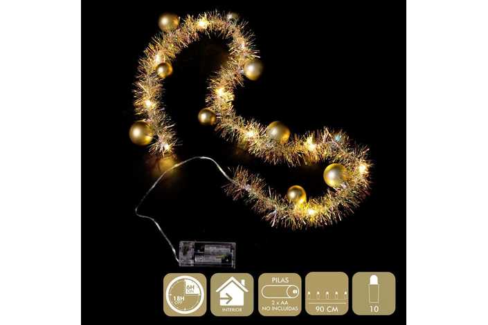 FUNCIONA A PILAS: 2 X AA (NO INCLUIDAS). IP20 (SOLO USO INTERIOR) CABLE TRANSPARARENTE DISTANCIA ENTRE BOMBILLAS: 10 CM. 10 LEDS DE LUZ CÁLIDA EXTENSIÓN DE CABLE: 30 CM. ESTE PRODUCTO TIENE TEMPORIZADOR AUTOMÁTICO: 6 HORAS DE FUNCIONAMIENTO / 18 HORAS APAGADO. TAMAÑO BOLA GRANDE: 4 CM. TAMAÑO BOLA PEQUEÑA: 2,50 CM. PRESENTACIÓN EN CAJA DE PVC Y ETIQUETA DE COLOR.
