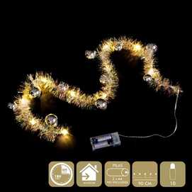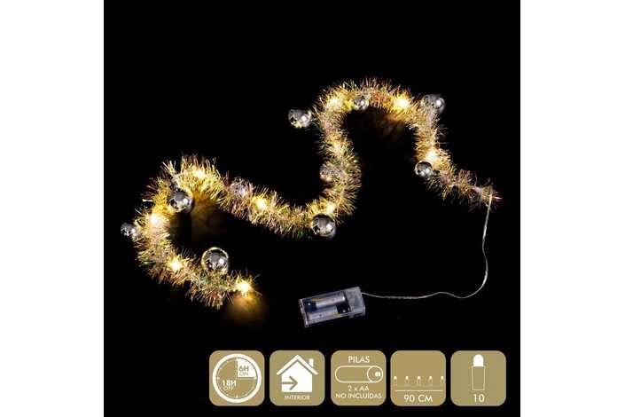 FUNCIONA A PILAS: 2 X AA (NO INCLUIDAS). IP20 (SOLO USO INTERIOR) CABLE TRANSPARARENTE DISTANCIA ENTRE BOMBILLAS: 10 CM. 10 LEDS DE LUZ CÁLIDA EXTENSIÓN DE CABLE: 30 CM. ESTE PRODUCTO TIENE TEMPORIZADOR AUTOMÁTICO: 6 HORAS DE FUNCIONAMIENTO / 18 HORAS APAGADO. TAMAÑO BOLA GRANDE: 4 CM. TAMAÑO BOLA PEQUEÑA: 2,50 CM. PRESENTACIÓN EN CAJA DE PVC Y ETIQUETA DE COLOR.