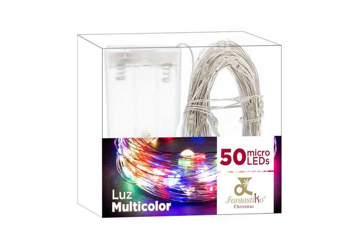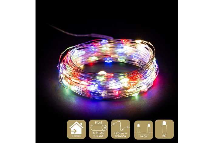 FUNCIONA A PILAS: 2 X AA (NO INCLUIDAS). IP20 (SOLO USO INTERIOR) CABLE TRANSPARARENTE DISTANCIA ENTRE BOMBILLAS: 10 CM. 50 LEDS DE LUZ MULTICOLOR EXTENSIÓN DE CABLE: 30 CM. ESTE PRODUCTO NO TIENE LA FUNCIÓN DE TEMPORIZADOR. PRESENTACIÓN EN CAJA DE PVC Y ETIQUETA DE COLOR.