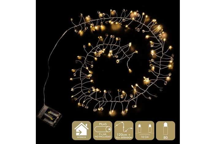 FUNCIONA A PILAS: 3 X AA (NO INCLUIDAS). IP20 (SOLO USO INTERIOR) CABLE DE COLOR MARRÓN DISTANCIA ENTRE BOMBILLAS: 10 CM. 80 LEDS DE LUZ CÁLIDA EXTENSIÓN DE CABLE: 30 CM. (COLOR TRANSPARENTE) ESTE PRODUCTO NO TIENE LA FUNCIÓN DE TEMPORIZADOR. TAMAÑO DE LA LÁGRIMA: 0,50 X 0,70 CM. PRESENTACIÓN EN CAJA DE PVC Y ETIQUETA DE COLOR.