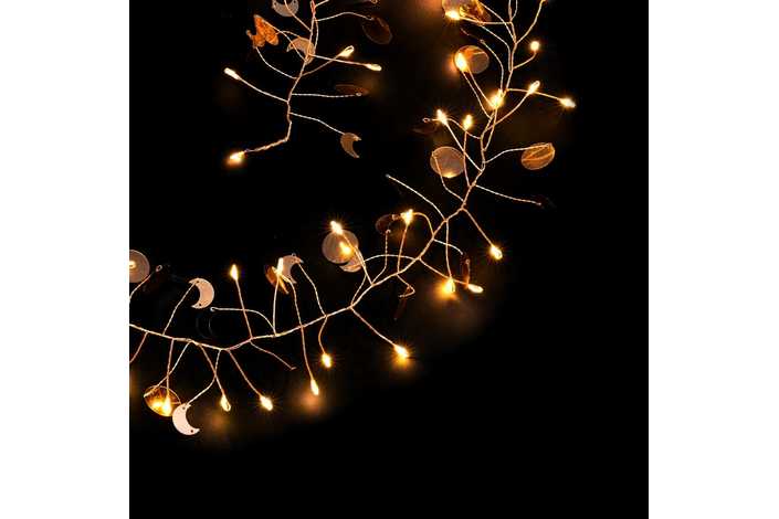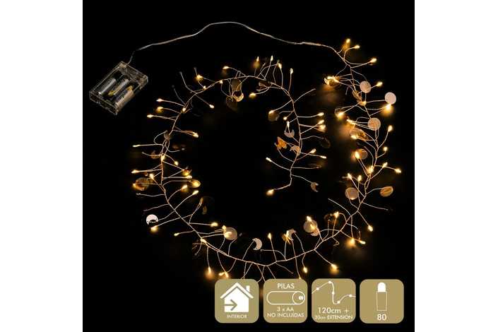 FUNCIONA A PILAS: 3 X AA (NO INCLUIDAS). IP20 (SOLO USO INTERIOR) CABLE COLOR ORO Y CABLE EXTENSIÓN EN TRANSPARARENTE DISTANCIA ENTRE BOMBILLAS: 10 CM. 80 LEDS DE LUZ CÁLIDA EXTENSIÓN DE CABLE: 30 CM. ESTE PRODUCTO NO TIENE LA FUNCIÓN DE TEMPORIZADOR. PRESENTACIÓN EN CAJA DE PVC Y ETIQUETA DE COLOR.