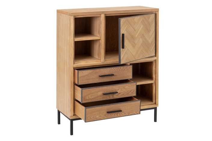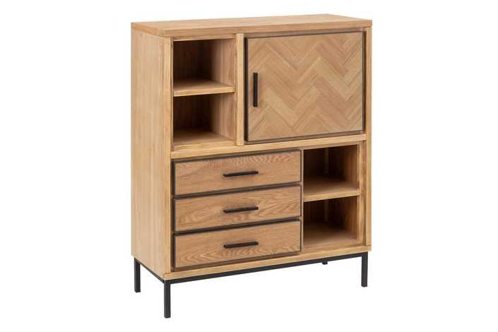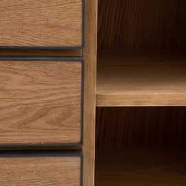 Material: Madera de fresno, metal, DM. Altura patas: 15.5cm. Patas para montar. Medida cajones: 54.5x13cm. Medida puerta: 51.5x42.5cm. Contiene leja interior, huecos: 29.5x20cm.