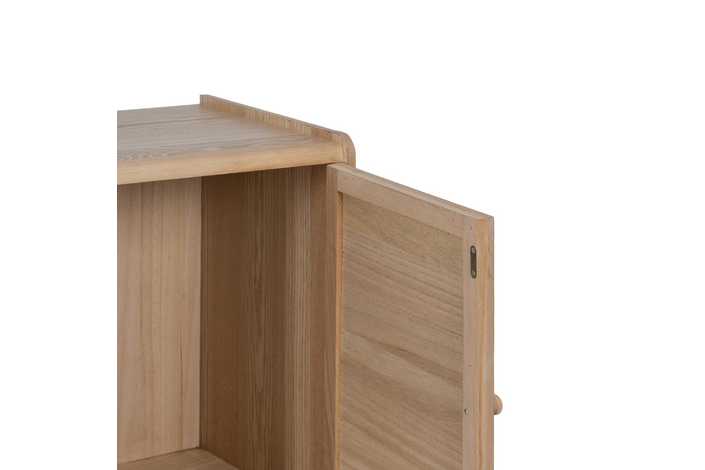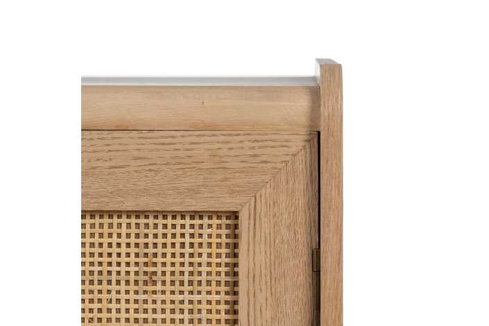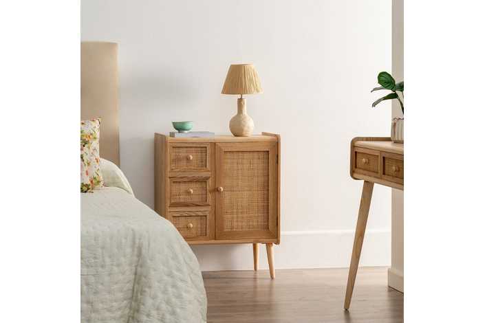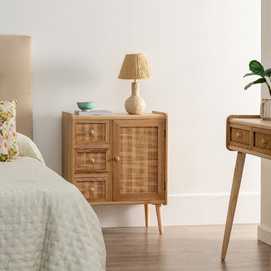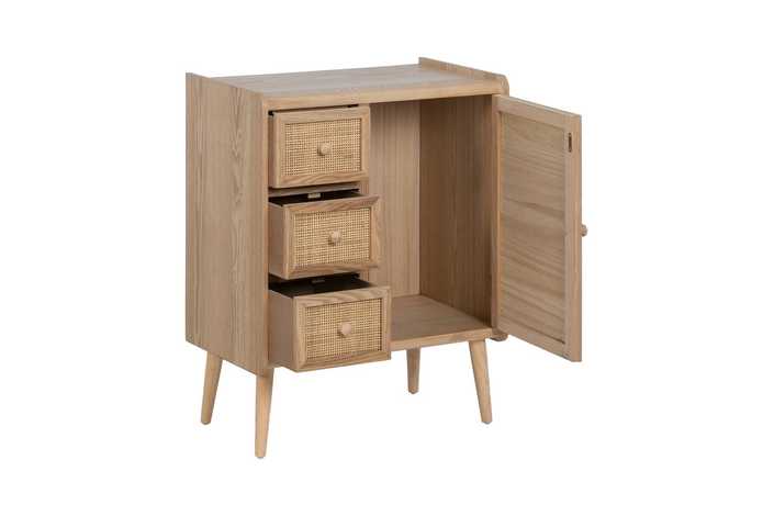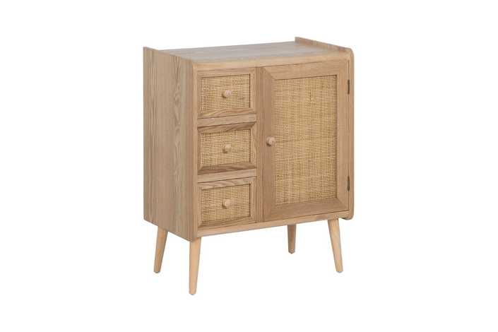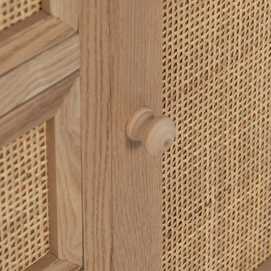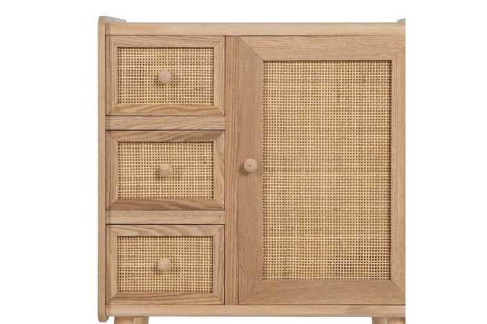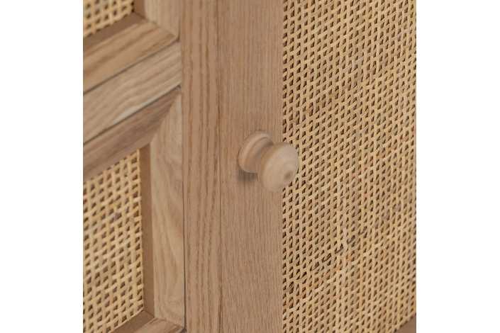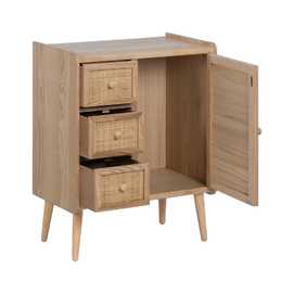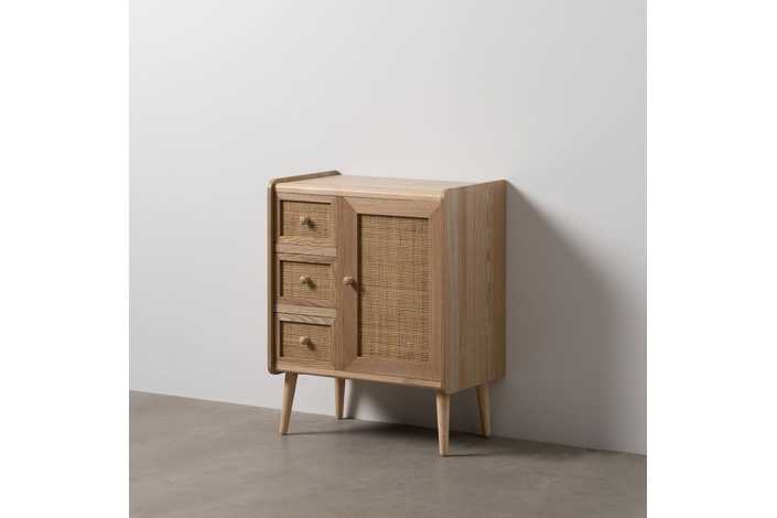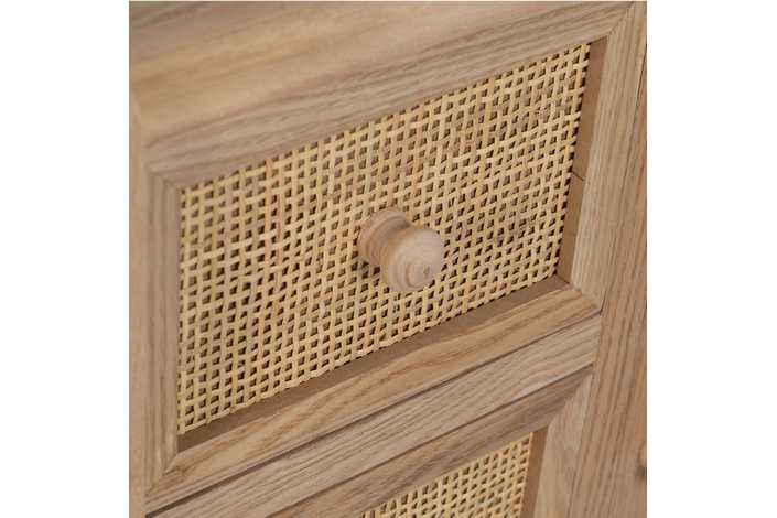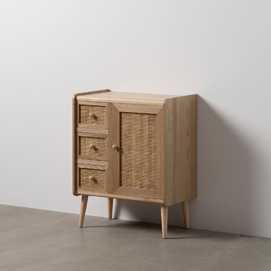 Material 3 cajones y puerta: DM y ratán. Medidas cajones: 22x15cm. Medidas puerta: 32,5x50cm. Peso soportado en cada cajón: 8kgs. Material de la estructura: DM y madera de Paulonia. Material tiradores: Madera de pino. Altura de las patas:19 cm. No incluye balda.