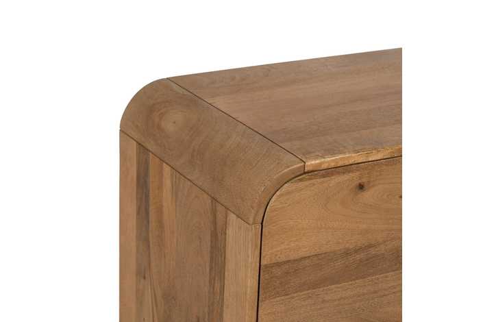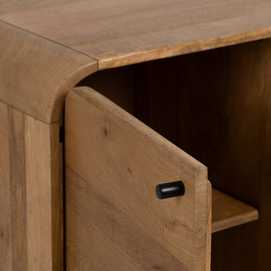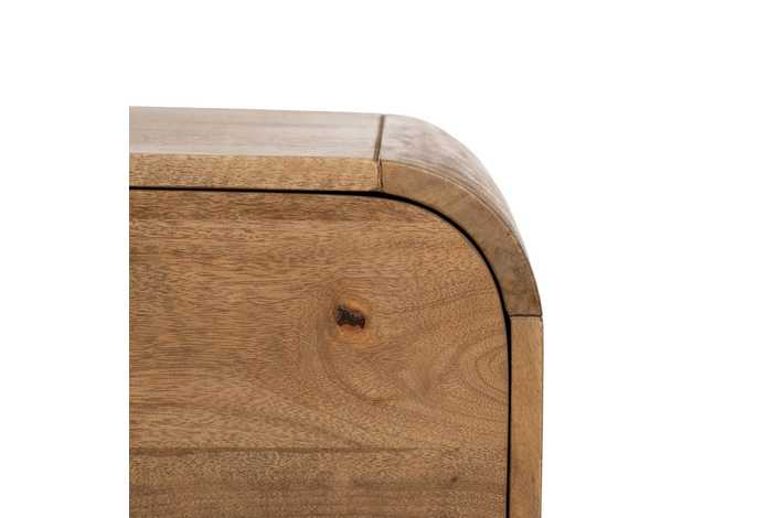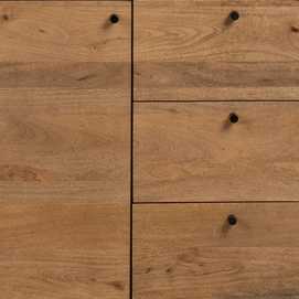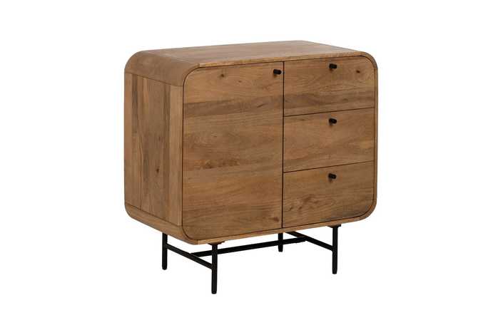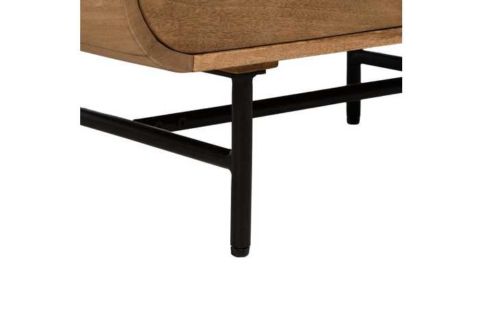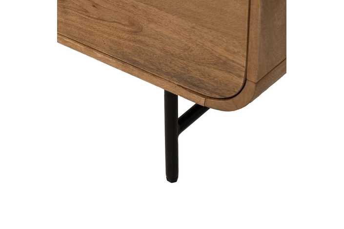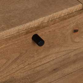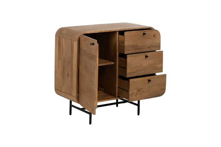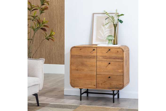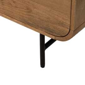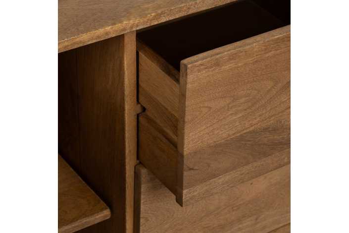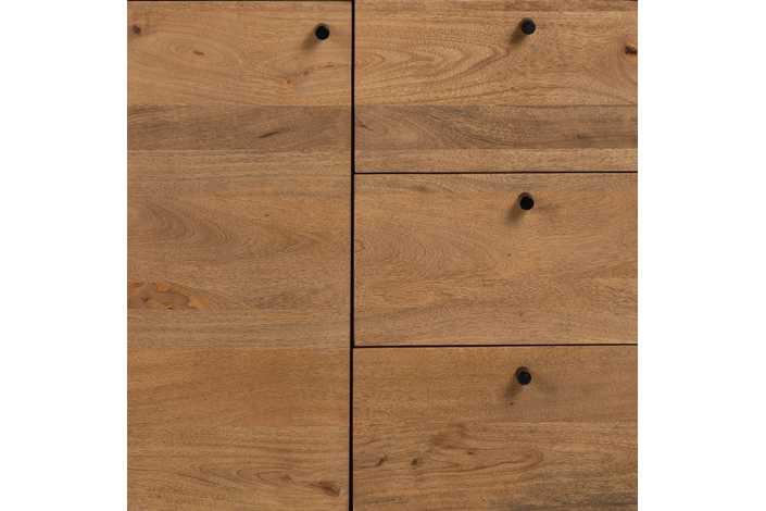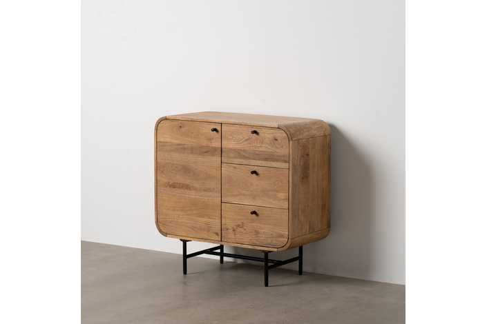 Material: madera de mango, hierro. Puerta: 38,5x59cm. Cajones: 38x19,5cm. Altura patas: 19cm. 1 leja interior a mitad de altura.