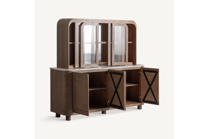 Mueble bar, fabricado en madera roble en color marrón, combinado con mármol en color blanco y cristal en color transparente.