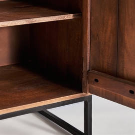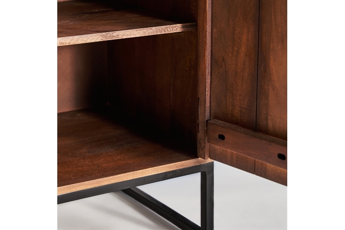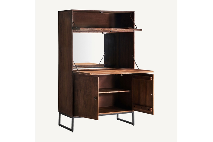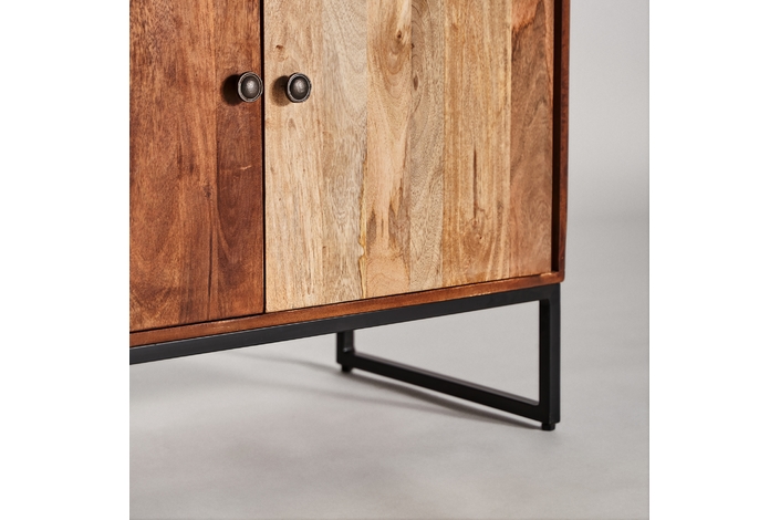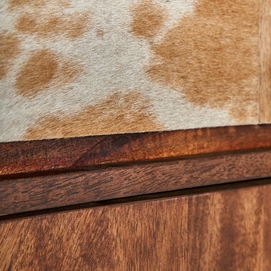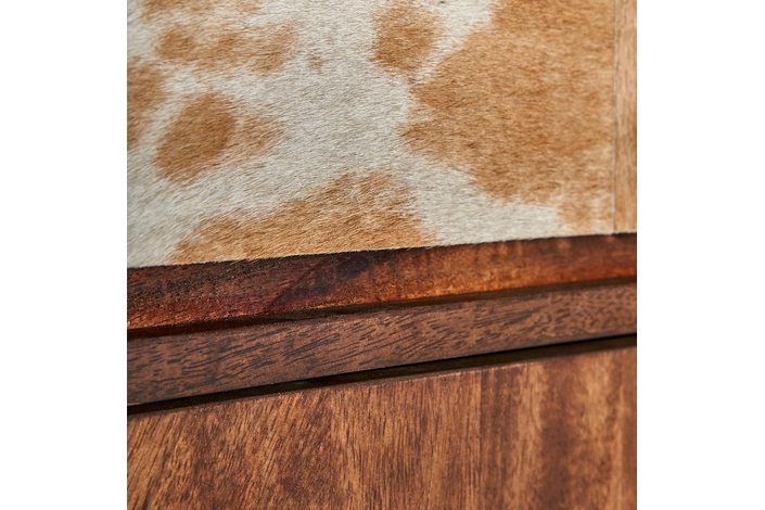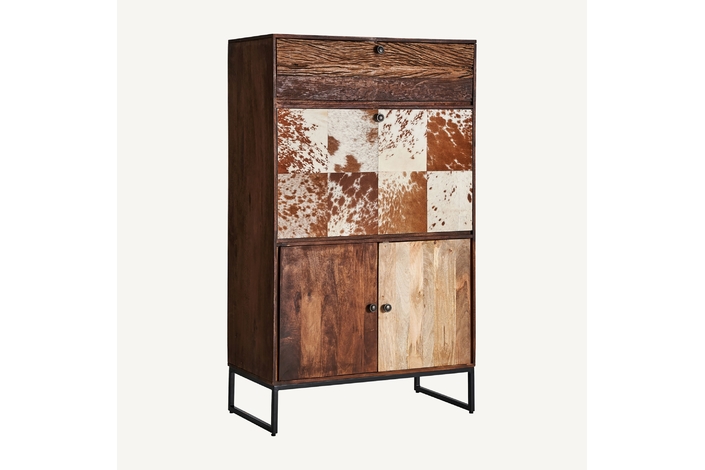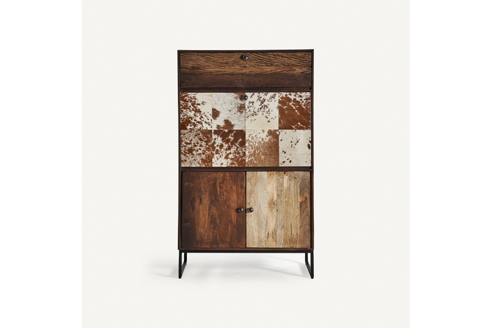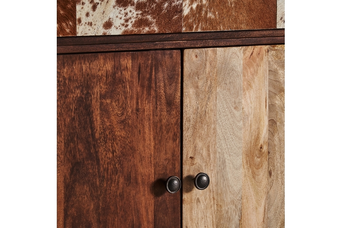 Mueble bar texas, en color marrón/beige, de estilo nórdico. Fabricado en madera de mango reciclada, combinado con forja y piel de vaca.