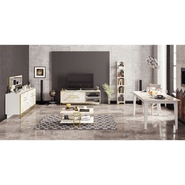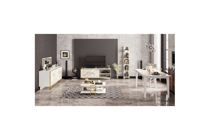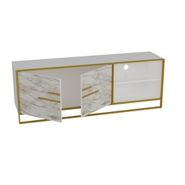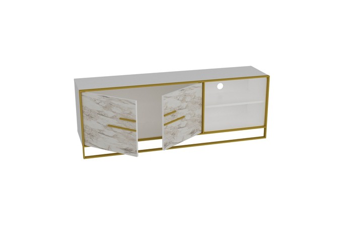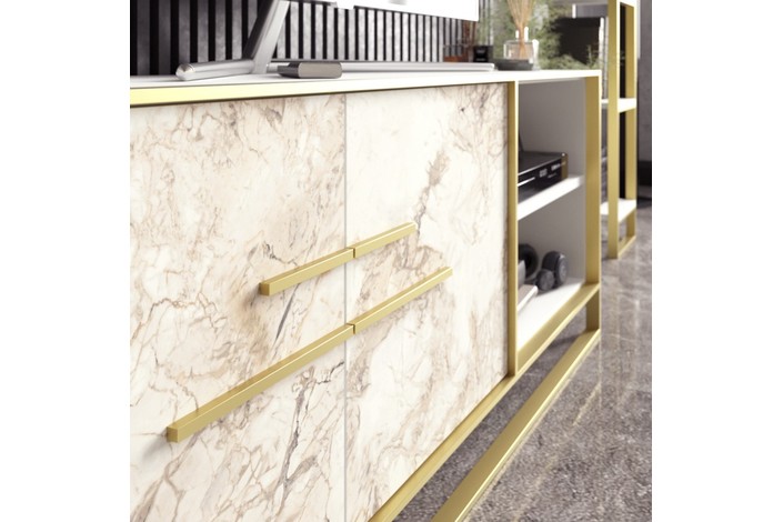 -Acabado bilaminado de color blanco con 2 puertas frontales en mármol blanco con detalles en metal dorado