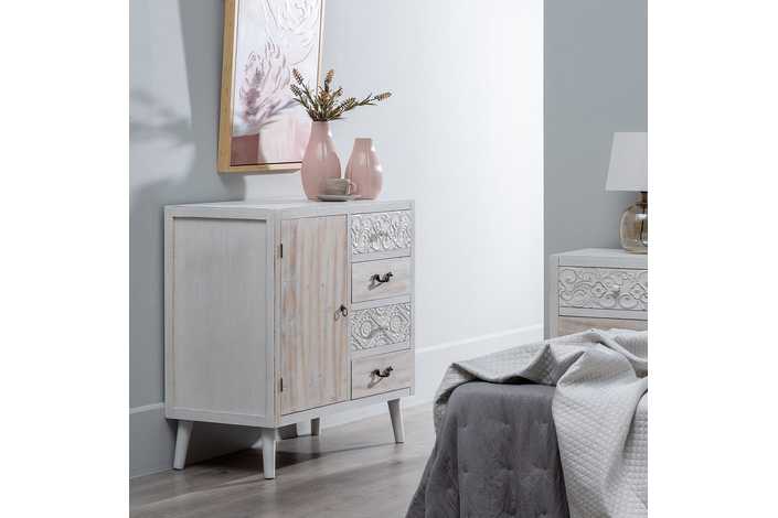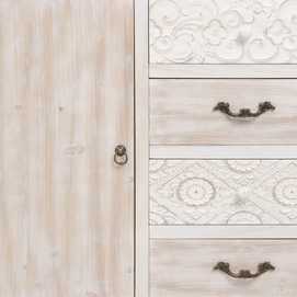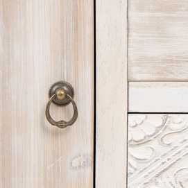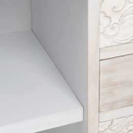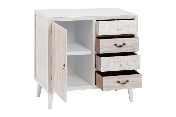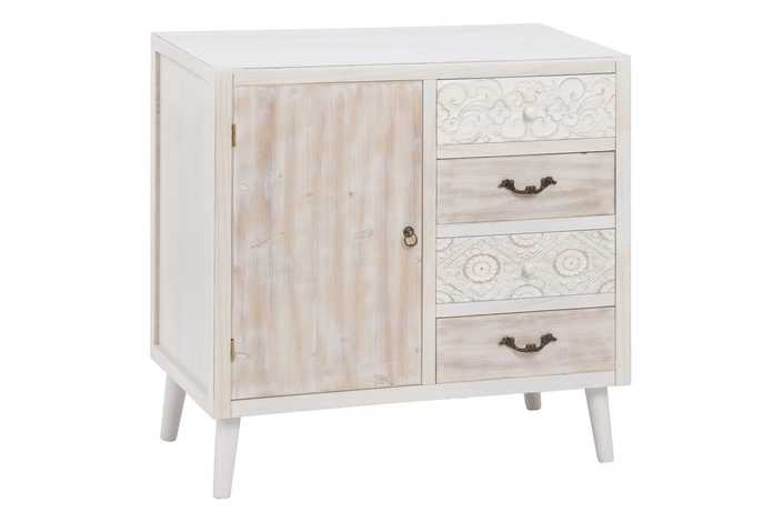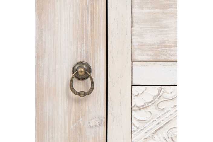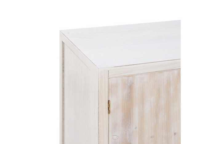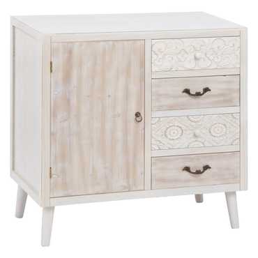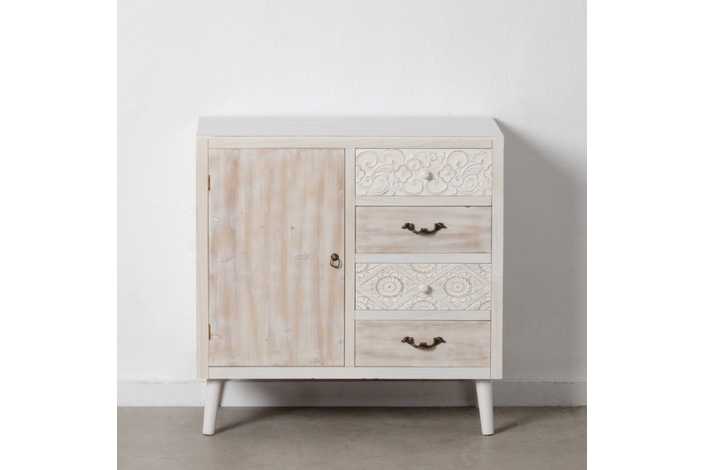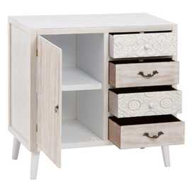 Material: estructura principal madera de abeto - resto Dm. Altura patas: 15cm. Medida cajones: 35,5x12,5cm. Medida puerta: 35.5x57.5cm. Leja interior: huecos de 37x30cm. Patas para montar.