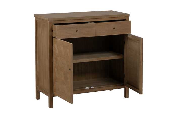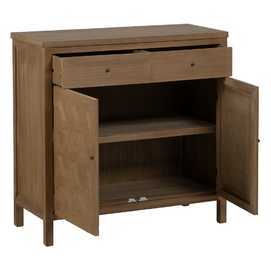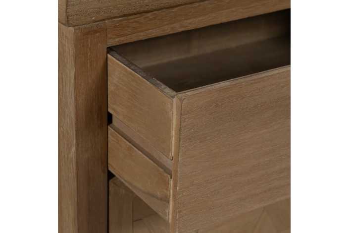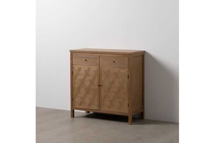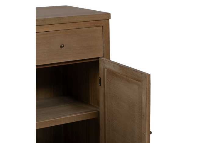 Material: estructura principal madera de paulonia - resto Dm. Altura pata: 10.5cm. Medida cajón: 40.5x13.5cm. Medida puerta: 40.5x56.5cm. Leja interior, altura huecos: 26 - 29.5cm. No precisa montaje.