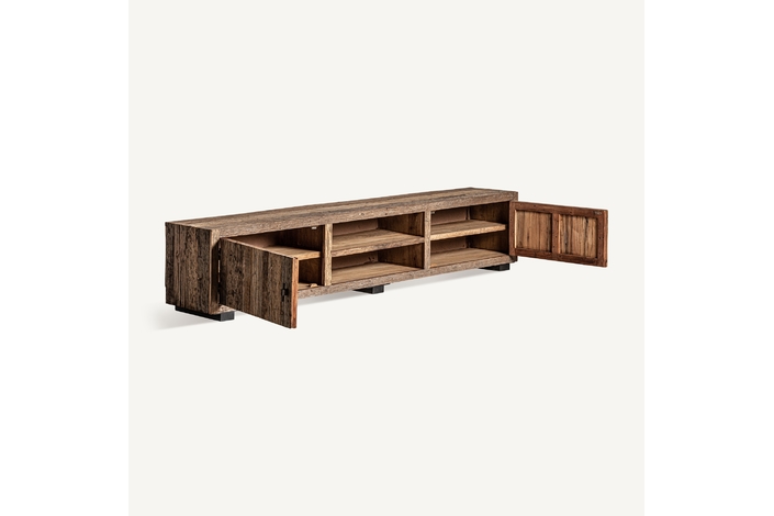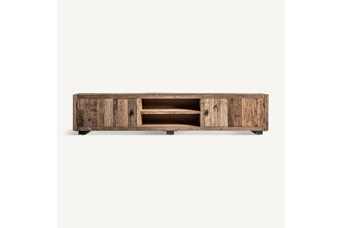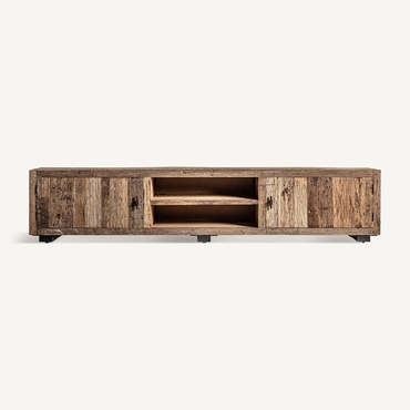 Con 250x44x51cm, el Mueble T.V. CARRIK de VICAL home destaca por su extensión y la belleza simplista de su madera de pino natural. Este mueble tv madera natural, elegante y funcional, se adapta perfectamente a cualquier interior gracias a su acabado natural, proporcionando un espacio generoso para entretenimiento y almacenamiento.