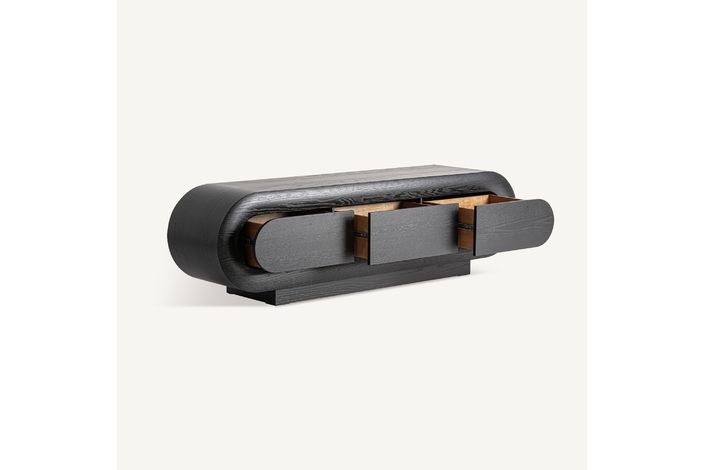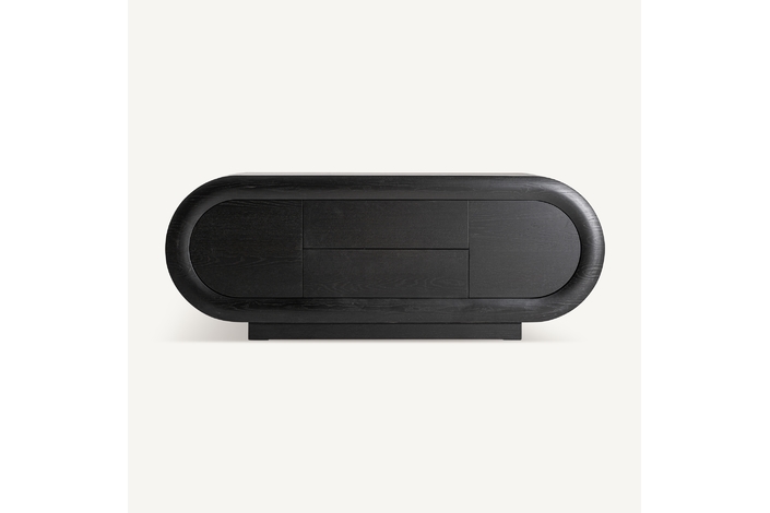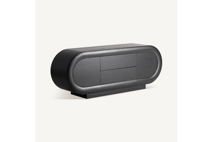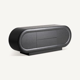 El mueble TV Chamonix combina estética art déco y diseño minimalista. Fabricado en roble negro, su silueta ovalada y líneas limpias aportan serenidad visual. Un mueble sofisticado y equilibrado que aporta orden y personalidad al salón.