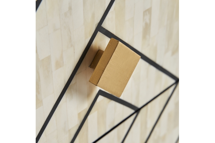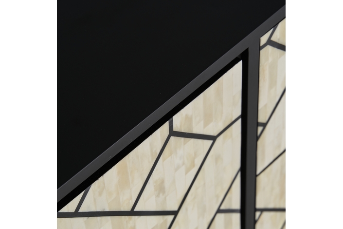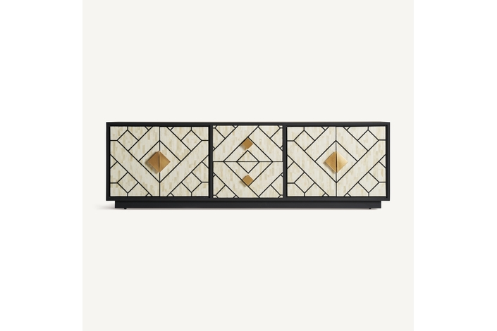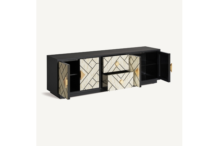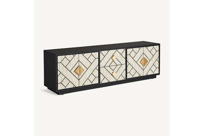 El Mueble Tv CHARMES de VICAL home es la personificación de la elegancia tricolor. Con 180x40x55cm, este mueble televisor no desmontable en hierro presenta un frontal exquisito en hueso, en una combinación estelar de negro, blanco y oro. Es una declaración de sofisticación y un punto focal irresistible en cualquier hogar.