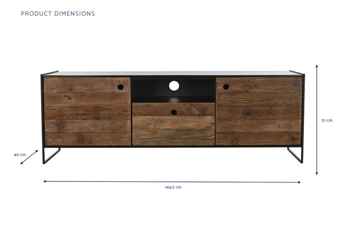 Dimensiones (cm) Longitud 144,5  |  Fondo 40  |  Altura 51 Material Madera reciclada  |  Pino