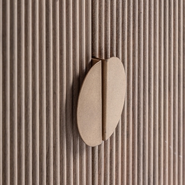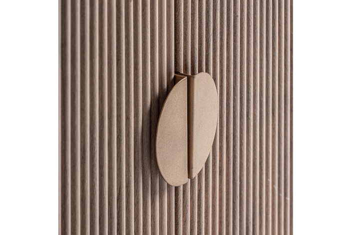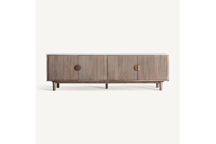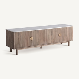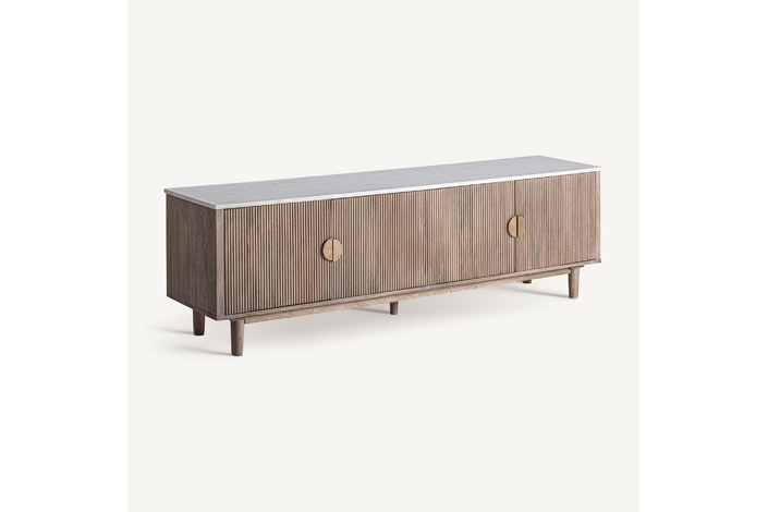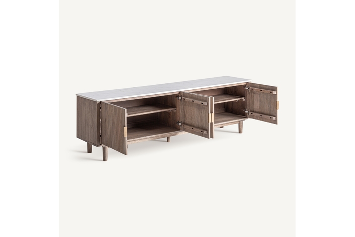 Mueble tv Zerf de estilo contemporáneo, fabricado en madera de mango en color marrón, combinado con mármol en color blanco y madera dm en color marrón.