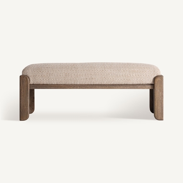 Pie de cama Liermo de estilo contemporáneo, fabricado en yute en color blanco roto, combinado con madera de mango en color marrón.