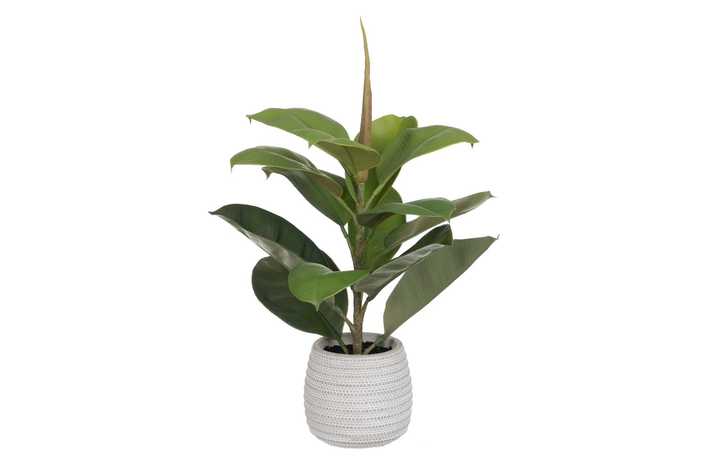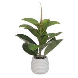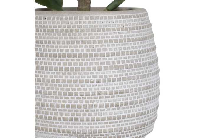 Material planta: PEVA, polietileno, poliestireno, hierro. Material maceta: polietileno. Interior maceta: Cemento cubierto de arena. Planta con protección UV.