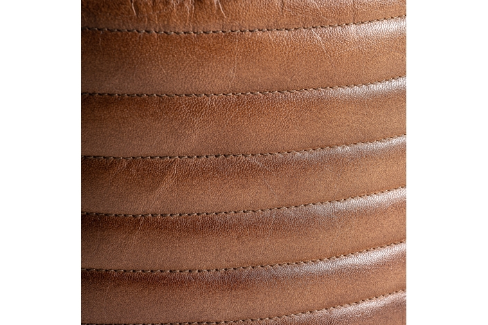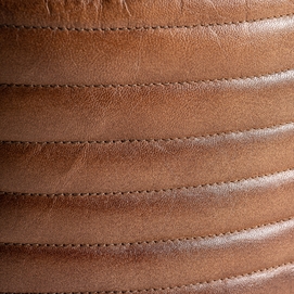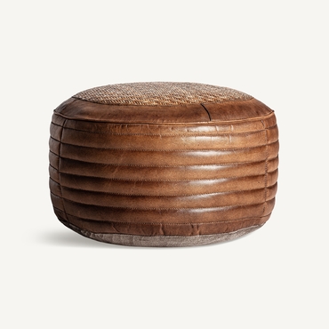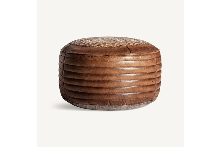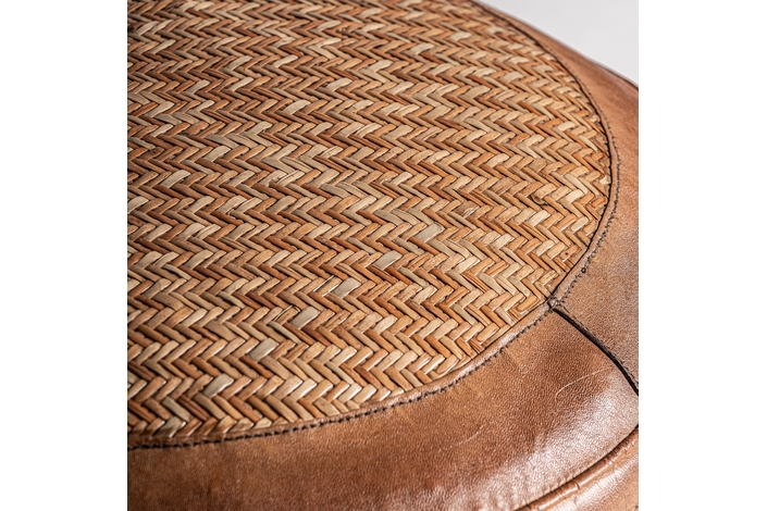 Puff krokom, en color marrón, de estilo vintage. Fabricado en piel, combinado con ratán.