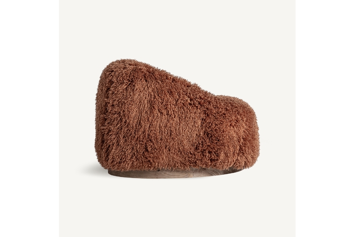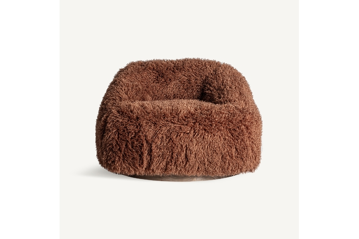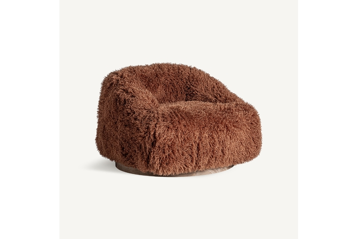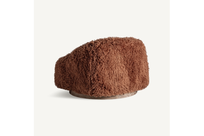 Puff pavia, de estilo contemporáneo. Fabricado en poliéster, en color marrón, combinado con madera de pino y hierro, en color dorado.