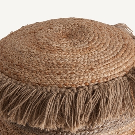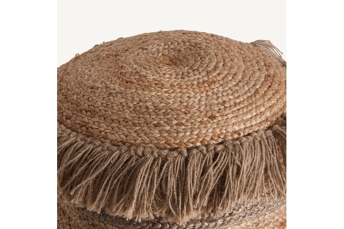 Puff redondo tassarolo, en color marrón, de estilo vintage. Fabricado en yute, combinado con algodón.