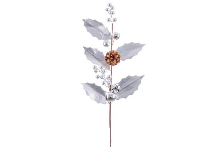 RAMA HOJAS PLATA PIÑA ACEBO 65 CM