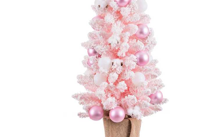 DECORADO CON BOLAS (ROSAS: 7 CM Y BLANCAS: 6 CM) Y FLORES DE ALGODÓN. DIÁMETRO DEL ÁRBOL: 40CM. MACETA CON TELA DE SACO.