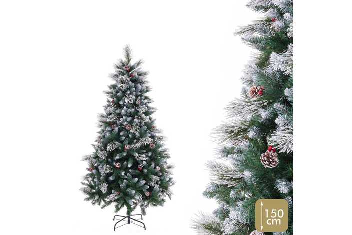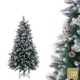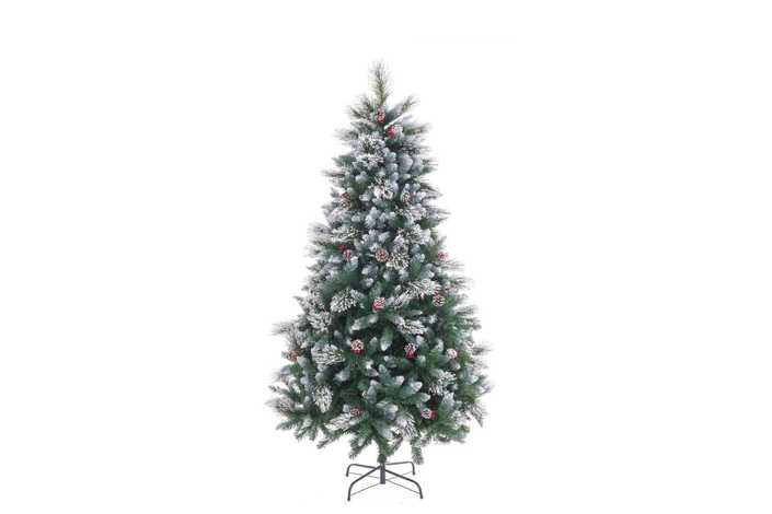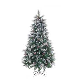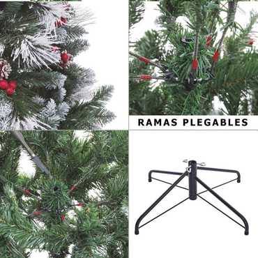 TIPO DE RAMAS: PLEGABLES IGNÍFUGO: SI MATERIAL: PE-PVC ÁRBOL DESMONTABLE: SI MATERIAL PIE: METAL CON NIEVE Y ACEBO.