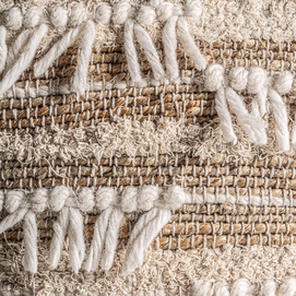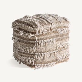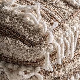 Reposapiés zuri, en color tonos en marrón, de estilo boho. Fabricado en yute, combinado con algodón y lana. Producto desenfundable.