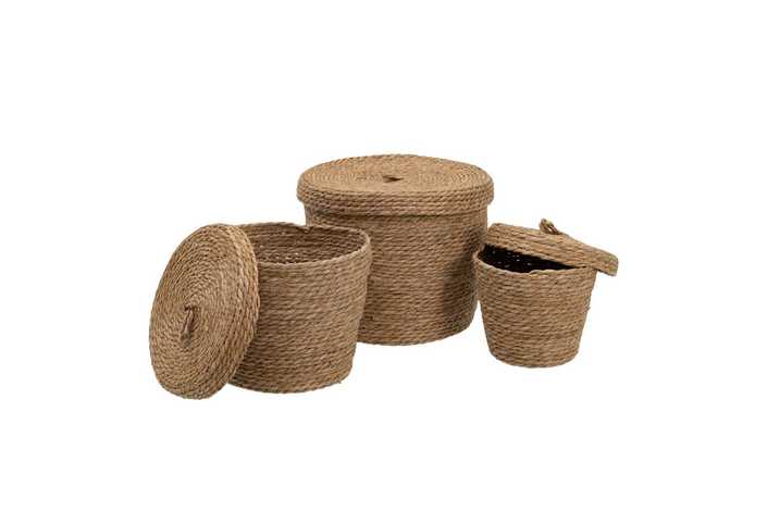 Material: fibra de junco y hoja de maíz. Medidas: 28x28x36cm - 24x24x30cm - 20x20x24cm.