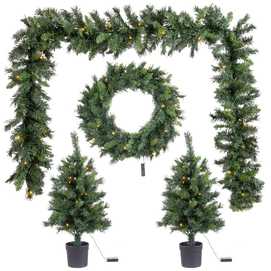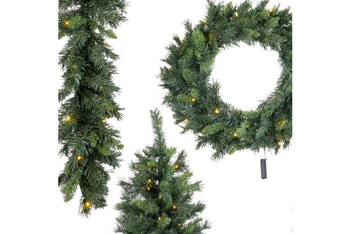 FUNCIONA CON PILAS: 3XAA CADA PIEZA (NO INCLUIDAS). IP44 (USO INTERIOR Y EXTERIOR). ESTE PRODUCTO TIENE TEMPORIZADOR AUTOMÁTICO: 6 HORAS DE FUNCIONAMIENTO. CORONA: 160 RAMAS Y 25 LUCES LED Y 60 CM DE DIAMETRO. GUIRNALDA: 240 RAMAS, 35 LUCES LED Y 270 CM DE LARGO. 2X ÁRBOLES CON MACETERO: 149 RAMAS, 35 LUCES LED Y 90 CM DE ALTO. DIÁMETRO DE CADA ÁRBOL: 45 CM. MACETAS DE PLÁSTICO EN COLOR NEGRO: 16 X 16 X 15 CM.