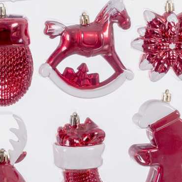 PRESENTACIÓN EN CAJA DE PVC: 24,70 X 6,20 X 27,20 CM. SURTIDO COMPUETO POR: GUANTE DE 10 CM (ACABADO EN BRILLO) + CIERVO DE 11 CM (ACABADO EN MATE) + CABALLITO DE 11 CM (ACABADO EN MATE) + CALCETÍN DE 11 CM (ACABADO EN BRILLO) + FLOR DE 8 CM (ACABADO ENBRILLO) + MUÑECO DE JENGIBRE DE 12 CM (ACABADO EN MATE)