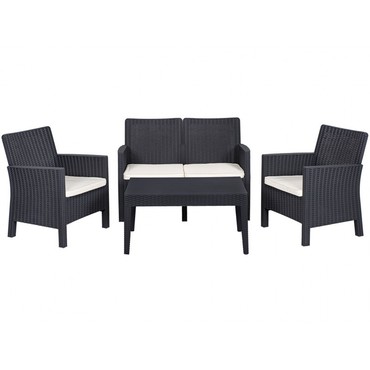 Set compuesto de: 2 unidades de Sillón, 1 unidad de Sofá de 2 plazas y una unidad de mesa baja, 100 % polipropileno color antracita. Cojines incluidos. Uso exterior e interior
