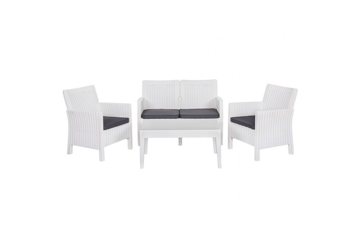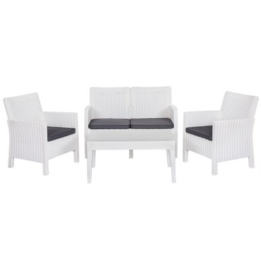 Set compuesto de: 2 unidades de Sillón, 1 unidad de Sofá de 2 plazas y una unidad de mesa baja, 100 % polipropileno color blanco. Cojines incluidos. Uso exterior e interior