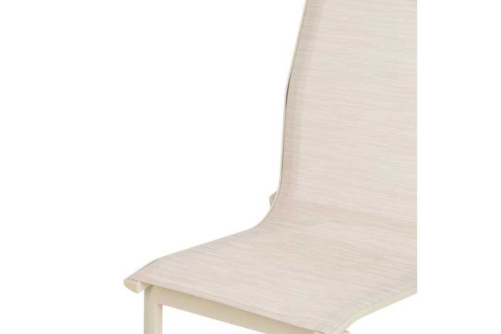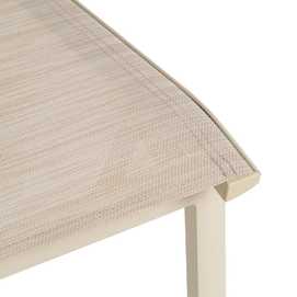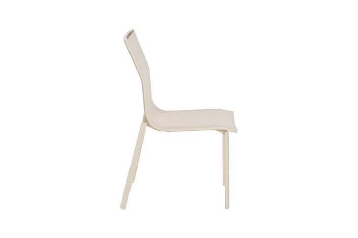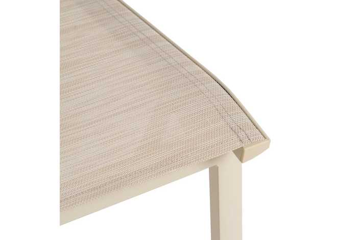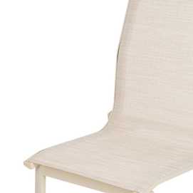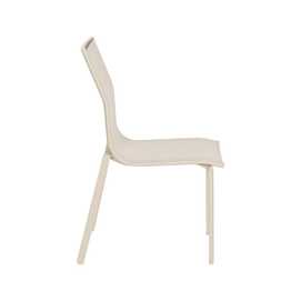 Material: aluminio, textileno (70% PVC, 30% poliéster). Altura asiento: 45cm. Profundidad asiento: 41cm. Ancho asiento: 43,5cm. Altura respaldo: 45cm. Apilable. Cumple la normativa EN581 (uso exterior).