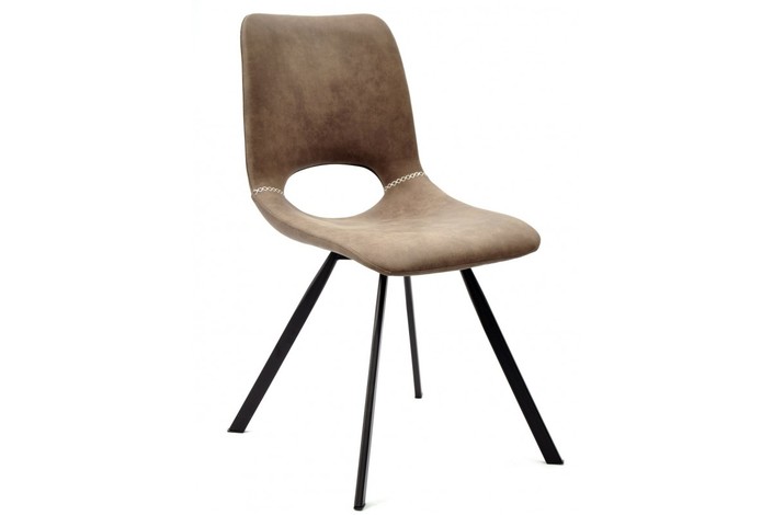 Silla de diseño, armazón metálico con acabado epoxi negro, asiento y respaldo tapizados en similpiel de color marrón oscuro. Taburete a juego. Otros colores disponibles.