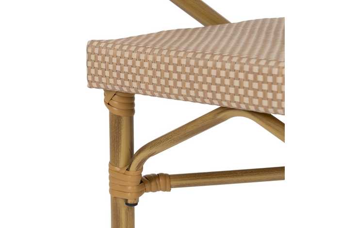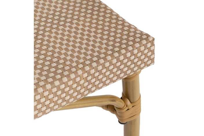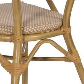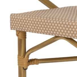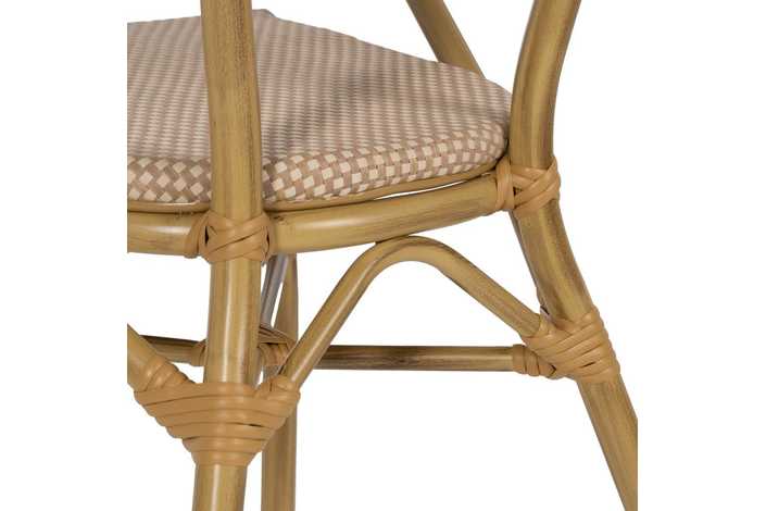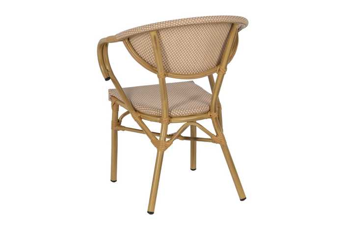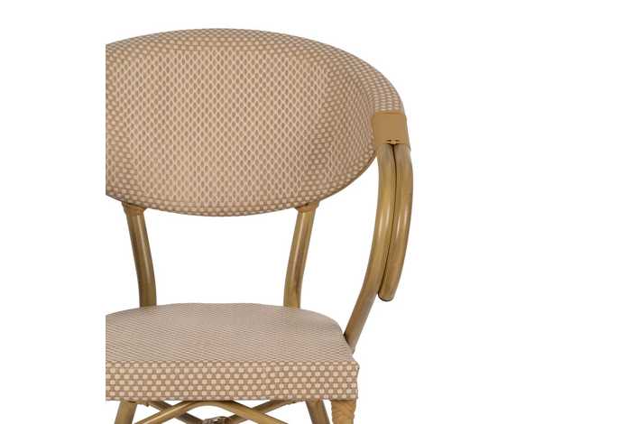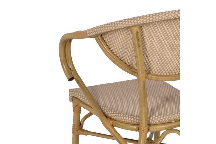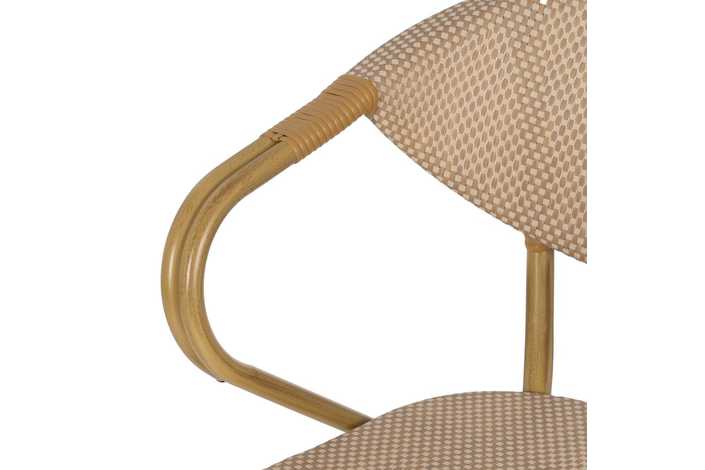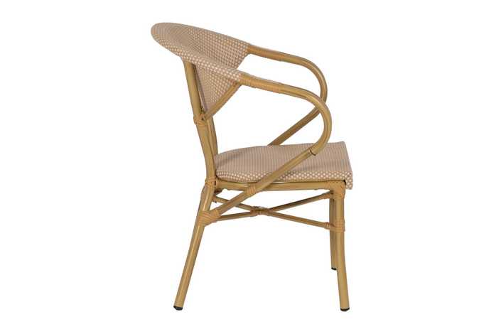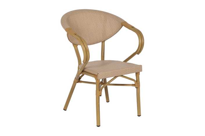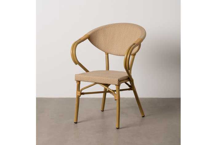 Material: aluminio, textileno. Altura asiento: 43cm. Ancho asiento: 40cm. Profundidad asiento: 42cm. Altura respaldo: 43cm. Altura reposabrazos: 28cm (71cm desde el suelo). Apilable.