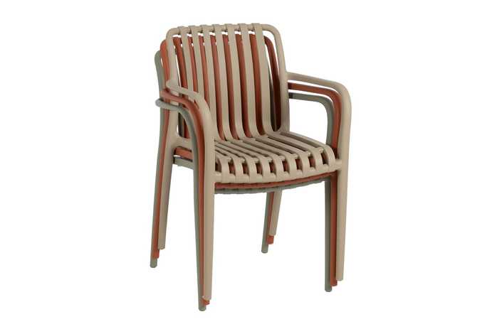 Material: polipropileno. Altura asiento: 46cm. Ancho asiento: 45cm. Profundidad asiento: 41cm. Altura respaldo: 40cm. Altura reposabrazos: 20cm (67cm desde el suelo). Apilable. Cumple la normativa EN581 (uso exterior).