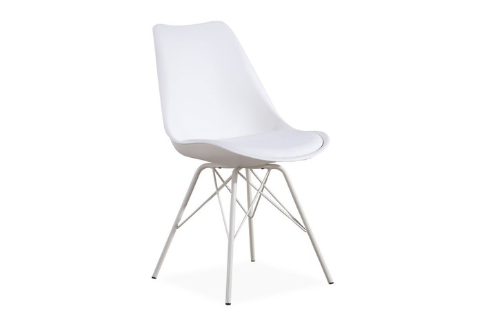 Silla moderna, base de acero con acabado blanco, carcasa de polipropileno blanca, cojín de asiento en similpiel blanco.