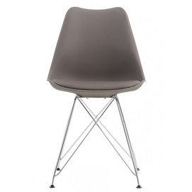 Silla de diseño, cromada, carcasa de polipropileno con cojín en similpiel gris oscura. Otros colores disponibles.