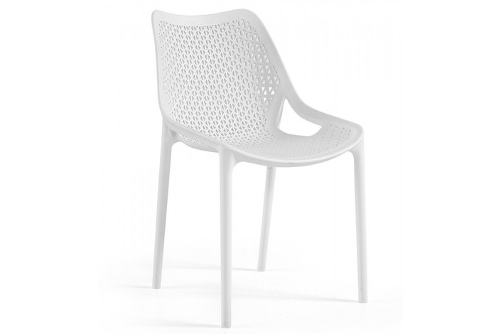 Silla de diseño, apilable,  polipropileno inyectado de color blanco, reforzada con fibra de vidrio. Tratamiento anti  rayos UV. Uso en exterior e interior. Otros colores disponibles.